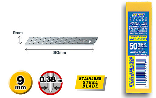 Лезвие, изготовленное из нержавеющей стали по запатентованной технологии OLFA с использованием многошагового процесса доводки, обеспечивающего высокое качество и остроту режущей кромки. Имеет двойной угол заточки и 13 режущих сегментов.