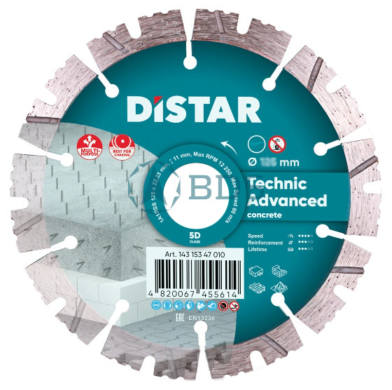 Алмазный диск DISTAR 1A1RSS/C3-H Technic Advanced 150x2,2/1,4x11x22,23-10 5D – универсальный диск для сухой резки бетона, тротуарной плитки и чёрного (реже – цветного) гранита на УШМ (углошлифовальные машины), а также железобетона, кирпича и песчаника. Благодаря особой форме сегментов (высота 12 мм) эффективно охлаждается в закрытых кожухах штроборезов, поэтому подходит для выполнения работ по штроблению под электропроводку и водопровод.